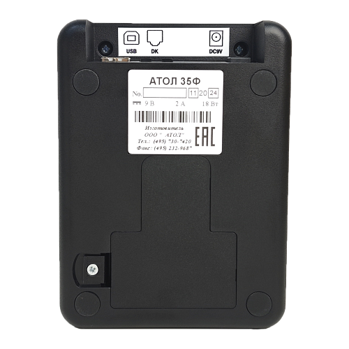 Если у Вас ограниченно пространство под кассовый аппарат, то этот фискальный регистратор не займет много места у Вас на рабочем столе или прилавке. Квадратная форма без выступающих деталей. Оснащен металлической гребенкой для отреза чеков. Корпус из прочного антистатического пластика надежно защищает печатающий механизм от повреждений, пыли и мелкого мусора. Удобная конструкция позволяет получить быстрый доступ к батарейке таймера и ФН без вскрытия корпуса. Яркий световой LED индикатор на передней панели АТОЛ 35Ф будет уведомлять вас о состоянии ККТ, отсутствии ленты, ошибках печати и т.п..