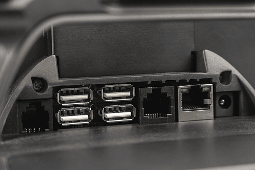 У онлайн-кассы все разъемы, кроме одного USB, расположенного сбоку, находятся снизу: 4 usb разъема, с помощью которых можно подсоединить сканер, весы и пинпад, разъем для денежного ящика, питания, COM-порт и Ethernet, однако смарт-терминал может передавать данные также с помощью Wi-Fi и SIM-карты.