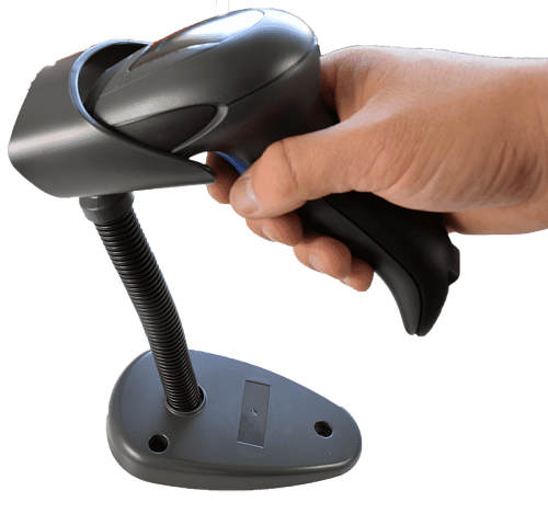 Луч сканера постоянно включен. Курок не работает. Считывание производится автоматически при попадании штрих-кода в поле луча сканера.