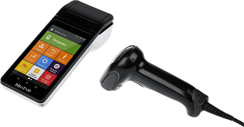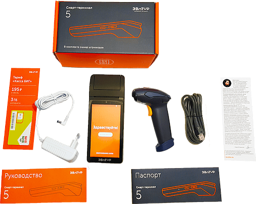 Эвотор 5 Стандарт: самый маленький и бюджетный из линейки Эвотор в комплекте со сканером штрих-кода 1D. Размером с мобильный телефон. Идеален для курьеров.