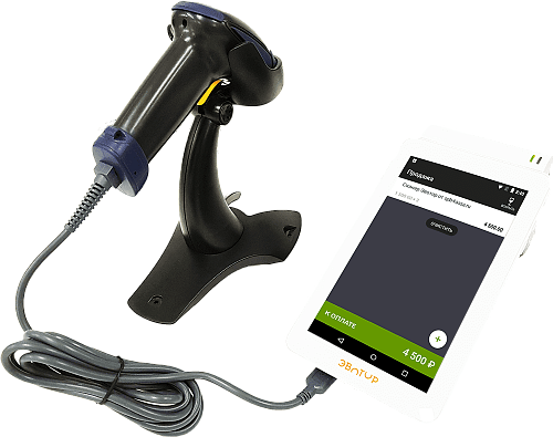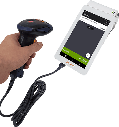 Эвотор Стандарт включает в себя 2D сканер штрих-кода беспроводной с USB-интерфейсом, который автоматически подключается к Эвотору без дополнительных драйверов и настроек.