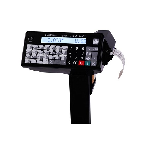 Настольные электронные фасовочные весы МАССА-К ВПМ-32.2-Ф с вертикальной стойкой, на которой расположен терминал с прорезиненной клавиатурой и ЖК дисплеем, а так же принтер этикеток. В весы можно сохранить до 20000 товаров. Связь с внешними устройствами осуществляется через интерфейсы RS-232, Ethernet. Есть возможность подключить сканер штрих-кода.