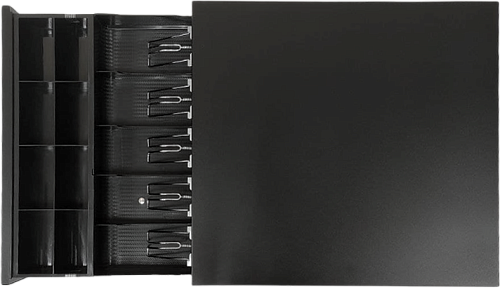 Денежный ящик PayTor HT-410P с автоматическим замком для подключения к POS-системам и кассовым аппаратам. Имеет 5 секций под банкноты и 8 под монеты. На передней панели расположена секретная прорезь для купюр большим номиналом.