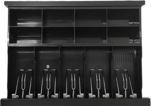 Ящик содержит 14 мест хранения: 5 ячеек для банкнот, 8 – для монет и 1 дополнительный отсек для чеков и ценных бумаг. Отделения для банкнот в этой модели специальным образом расширены, обладают покатым краем и металлическими фиксаторами, обеспечивая удобство работы с купюрами. Монетница вынимается.